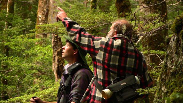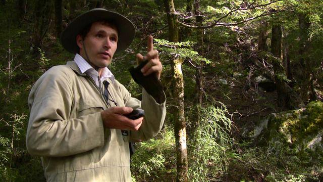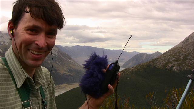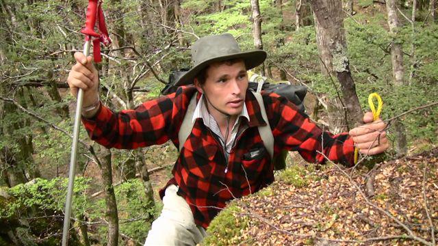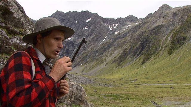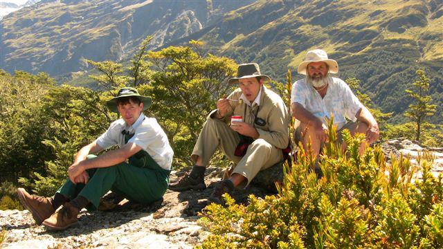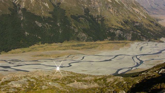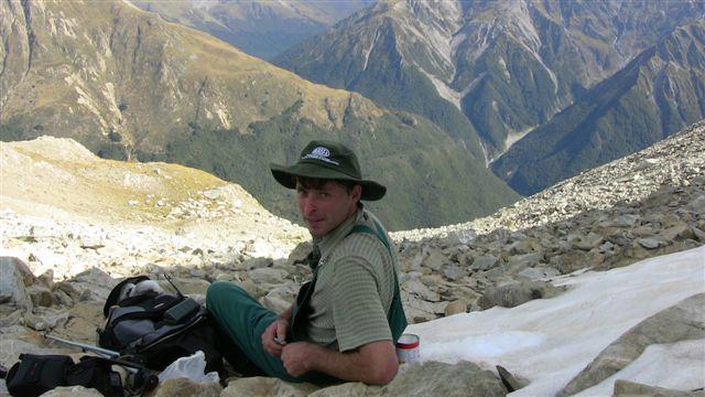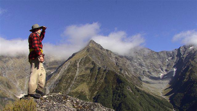 One day I whilst trekking through the bush. I had been filming some fantastic views from one peak and decided to meet up with my brother on another peak. We were in contact by radio and knew where each other was. I would have to drop a couple of thousand feet to the river valley… cross it, and climb another few thousand feet to meet him so we could do more video. The rocky outcrop where I was stood overlooked the Huxley Forks huts. They looked so small and faraway. The snowy mountains peaks, made all the more glorious with the last wreaths of early morning cloud lingering around the tops, towered majestically in the background of the picture book scene. Suddenly my thoughts were bought to an abrupt halt… "Where are you now?" called Simon on the radio. "I'm just putting the camera away" I replied as I turned to fasten the straps on my pack. "I won't be long; I just have to climb down off this knob."