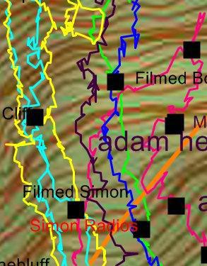 Simon had a little fun too… although thankfully he avoided anything dangerous or scary. Simon is like a centipede on the hills… with two ski poles in his hands and a pack upon his back he makes a rare sight when climbing! One day he decided to take the cell phone with him up one of the mountains. I'll give you a description of what we carried and what we ate. We carried packs loaded with camera equipment... 35mm and digital still cameras and HDV video cameras… plus all the necessary extras like microphones and earphones and spare tapes and film. Binoculars, a bottle of water, spare socks and shoes, survival kit and extra clothing. I carried my rope around my waist, but Simon preferred to store his rope in his pack. We all carried a tin of fruit of some kind. It was well worth the effort I assure you! And the empty tin was handy as a cup for drinking from the various streams and creeks on the way down. For breakfast we'd have Weet-bix with a tin of peaches and milk. Once up in the bush, we had muesli bars to snack on. Fruit Bars, dried fruit, tinned fruit and a small handful of mixed sweets made up our lunch. Jelly Beans turned out to be the best because of the high sugar content. We carried an amount of chocolate chips but rarely ate it. It made one too thirsty! The Apricot Muesli Bars were great energy boosters on a climb. After a days hiking we'd enjoy a good tea. The evening meal would be anything from fried rabbit to tinned stew. Always finishing up with plenty of cold jelly and tinned fruit! Yeast pancakes, with yeast used as the raising agent instead of baking powder were a great favourite too. Climbing such a rugged craggy mountainous area with so much gear was very hard going indeed. We always slept well at night. I wonder why!