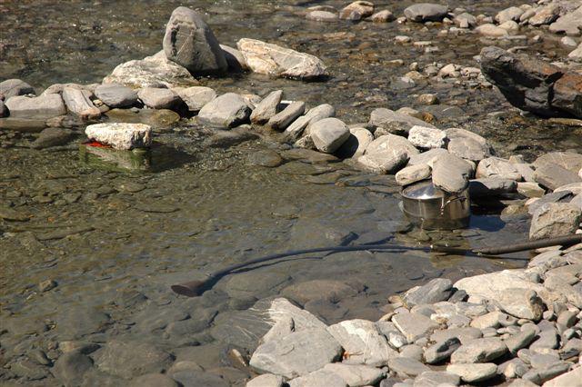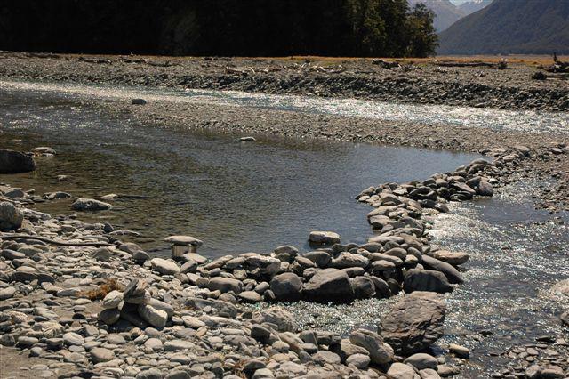 A Dam had to be built in the river to provide a suitable pool from where we could pump fresh drinking water and build a "fridge" to keep our meat, milk and butter cool. The "fridge" was an ex Airforce steel container originally used for carrying flares in aircraft. A friend gave it to us for the operations. A water pump driven by a petrol engine was set up down next to the dam to pump water up to the caravan, where we had several large storage tanks, so on days when the river was in flood we would have heaps of drinking water. Netting was placed across all the caravan windows to prevent sandflies entering. Tents were erected for the various supplies. However we learnt very quickly that we ought to have stored the food in large plastic bins with clip tops. We had packed biscuits and things into cardboard boxes… and soon found that the local mice had a delicate taste for gingernut biscuits, sugar, chocolate, and salt! They loved them!!!! Another large tent was set up right alongside the caravan to store food and also to hang wet clothes and jackets on rainy days. A shower tent and also a Toilet Tent was put not far from the caravan. A gas califont provided hot showers… and believe me it was lovely to have a piping hot shower after a long days hiking!