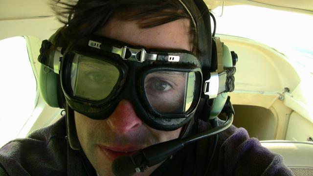 Finally they found a Cessna 172N from the local aero club at Gore. It was flown out by a pilot friend of Ryans. Upon arrival Ryan removed the passenger door so we would be able to film air to air with the Dragonfly. Gosh! I was cameraman on that flight, with Simon behind me with a backup camera running. With the passenger seat was removed as well, I had to sit on the floor of the cabin with my legs cross legged in front of me, and my back against the Pilots seat. I was protected from the wind by sheltering behind the front bulk head or firewall/dashboard. As the seat belt was fastened to the floor of the cabin, I had that clipped around me, but we were concerned it might not of been enough... considering I would basically be swinging on it from 3000ft or so! In my imagination I could feel myself already falling through space at 10,000 MPH in line for a particularly nasty bump on the head... and that didn't appeal to me in the slightest! However, Simon came up with a bright idea. A strop (truck tie down) was passed round me, round the pilots seat, under Simon's seat where a large knot was tied... and Simon sat on the knot just to make sure!!!! So with both the original seat belt and the strop, I would be safe as a house! Both planes took off together and soon merged into formation so we could start the video rolling. I soon realized I could not pan the camera successfully with my legs crossed. When the Dragonfly passed low down the camera had to point down. Thus it bumped into my knees! I had to shift... it mean my feet had to go out the door... into the full blast of a 185MPH slip stream. Within seconds my leg was frozen. It went numb! After 5 minutes it didn't matter about my leg because I couldn't feel it to start with! In the Cessna, Simon and I were issued with radio head sets so we could talk to our Pilot. This mean I would be about to give our Pilot directions, like "come up a bit", "drop down a bit" or "slacken off a little then come past in a hurry and peel off when I say to". These instructions were promptly forwarded to the pilot of the Dragonfly. While I gave our Pilot instructions to pass on to the Dragonfly, Simon was busy behind me with his camera. He didn't talk much, but I was too intent on the job at hand to realize why. After I had finished and the Dragonfly banked away to return to the Mandeville airfield, I was able to relax and look round at Simon for the first time since we had taken off 45 minutes earlier. I was stunned to look into Simon's eyes...