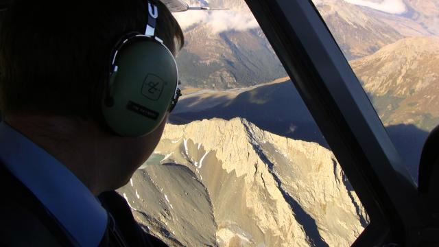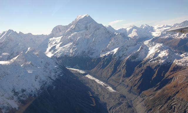 In the comfort of the cabin of Dragonfly ZK-AYR our Mother and Father flew with Pilot Ryan. They knew nothing of the hard time we were having until we landed. But the close formation flying made them tremble a bit at times. In fact, even I got a bit worried a few times at how close the two 'planes were. Not having done air to air photography before I wasn't use to flying so close, and believed it would have been a lot safer than we thought. However when we flew over some hill country to get a different background, the turbulence became quite rough and two aircraft seemed to lurch toward's each other with an uncanny motion that made me fearful of what could happen. It became so bumpy that my fear overcame my good sense, and I asked the two pilots to separate a little. The flight was a great success... even though my boot laces came undone and frayed the ends in the wind! Upon landing I couldn't walk for sometime... my legs were like a jelly, and they needed thawing out before they returned to normal. After all, what do you expect if you go hanging your legs in a 185mph gale?But with the scary bits aside it was a great experience... one I would prefer to only ever repeat on the hottest Summers day! As they say in all the best stories, "... all good things must come to an end." Thus it was, that one morning we decided we had completed all we had planned (and hoped) to do, so it was time to leave the wonderful people at Croydon Aircraft Company and move on... After other business in South Otago we headed north once more via Roxburgh to Alexandra to meet Evan Blanch and his wife once more... then back to Wanaka to see Don Middleton then through the Lindis Pass to Omarama where we saw Lex and Jan Perriam before continuing on to Twizel where we stayed for 3 or 4 days while we waited for the right weather to fly with Air Safaris. Twizel was a great place to stay. Simon and I went out after rabbits a few times in the drizzle with the shotgun. We were quite successful... The day we flew with Air Safaris dawned bright and beautiful although a fair amount of morning cloud. None the less we made our way north to Lake Tekapo Airport where we had an early lunch whilst waiting to see what the weather would do. About 1PM a 'plane took off for a trip around what is known as the "Grand Traverse", a flight around some of the most renown peaks of the Southern Alps. I booked a seat and went along. The Pilot, Tom Bradley, was extremely helpful... placing the aircraft in the best position for photography purposes. The other passengers were delighted at the views we encountered because of Toms skillful flying ability. We flew up Lake Tekapo into the Godley Valley, round Mt Conrad and directly over the Armadillio Saddle to the head of the Murchison Glacier. Passing over Starvation Saddle then the Tasman Saddle Hut, we passed under the lee of Mount Elle De Beaumont. This inspiring peak seemed incredible close... so close in fact, one would imagine you could reach out to touch the snow... lovely soft snow. It was to the north of our course which continued round over the Franz Josef Glacier, and the Fox Glacier where we soon looked up to see Mt Cook towering above us on our left hand side. After passing round to the south of Mt Cook we circled The Hermitage and gradually descended to land at Glen Tanner where we dropped the other passengers off. Tom and I then flew back to Lake Tekapo Airport alone.